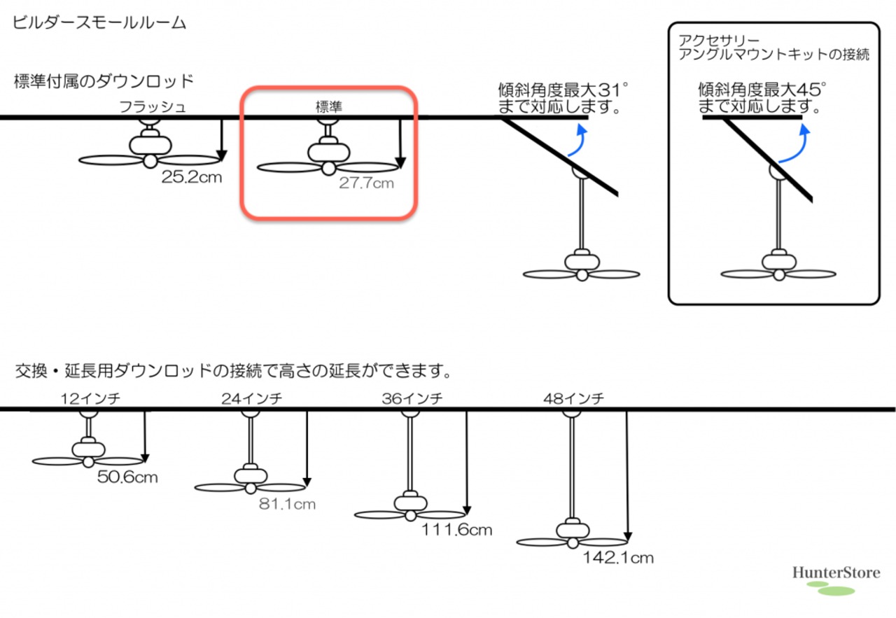 傾斜天井取付時、延長金具ダウンロッドの長さが短すぎますと、天井面と羽根が接近しすぎや接触する恐れがありますのでご相談ください。